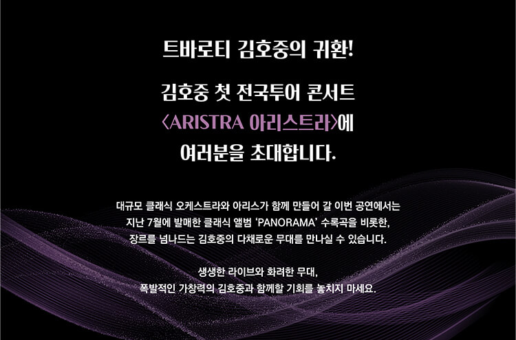 트바로티 김호중의 귀한! 김호중의 <ARISTRA 아리스트라>는 대규모 오케스트라와 아리스가 함께 하는 공연으로 지난 7월 발매한 클래식 앨범 'PANORAMA' 수록곡을 비롯한 장르를 넘나드는 김호중의 다채로운 무대를 만나실 수 있습니다.