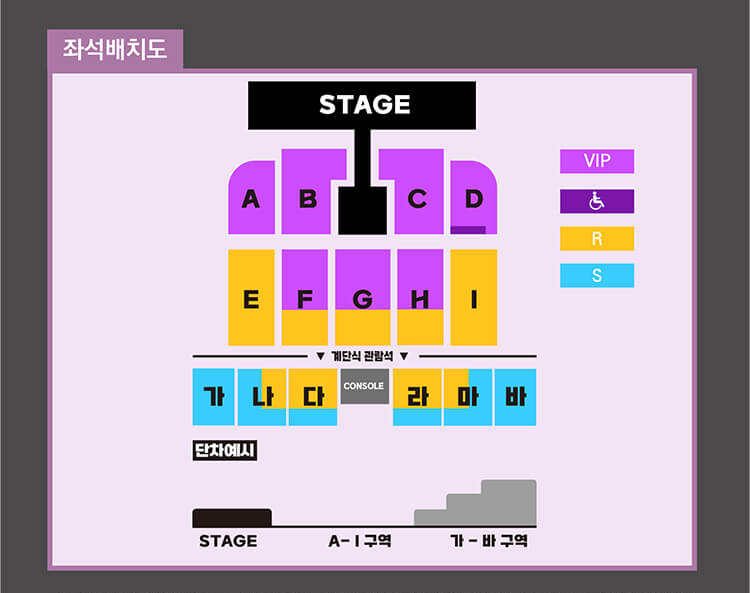 공연의 좌석은 전석 지정좌석제로 A~I 구역은 단차 없는 평지에 간이 의자가 설치된 좌석, 가~바 구역은 계단식 좌석입니다.