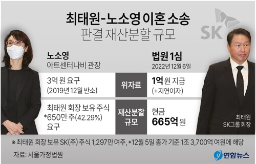 665억 원은 재산분할금 사상 최고액으로 당시 노소영 관장이 재산분할로 청구한 금액에는 모자란 액수입니다. 노소영 관장은 시가 1조 원이 넘는 SK 주식 절반을 재산분할로 청구했으나 법원은 665억 원으로 판결하였습니다.