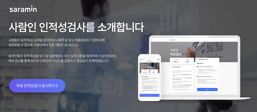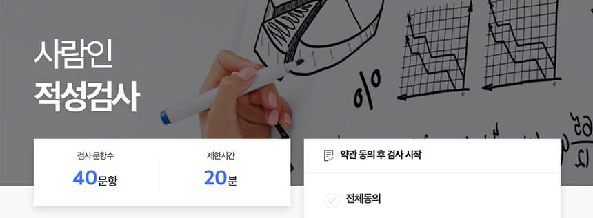 동양인의 성격 특성 및 능력을 분석하고 최신 성격 이론을 접목한 사람인에서 직접 개발한 검사입니다. 인성검사와 적성검사로 나뉘어 있으며 무료로 검사가 가능합니다. 사람인 인적성 검사는 삼성의 SSAT와 비슷하지만 난이도는 조금 낮은 편에 속합니다. 하지만 인적성검사가 처음이신 분들이나 인적성검사를 간단하게 테스트해보시는 분들은 한 번씩 해보시는 것을 추천드립니다.