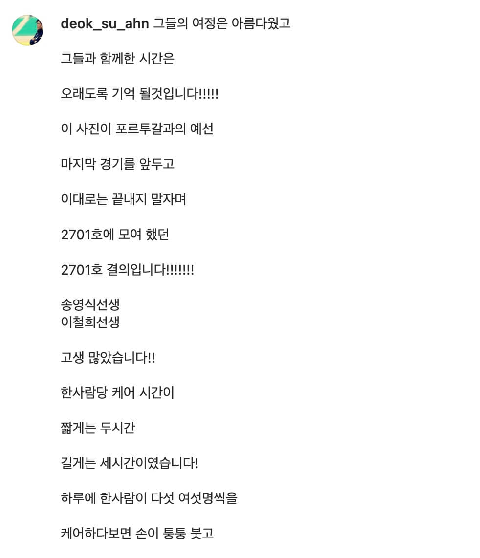 안덕수 트레이너의 게시글에는 손흥민을 비롯해, 황의조, 조규성, 정우영 등 주축선수들이 '좋아요'를 누르며 공감의 뜻을 나타냈고 기성용, 이근호 등 선배들도 '좋아요'를 누르며 동의의 뜻을 표했습니다.