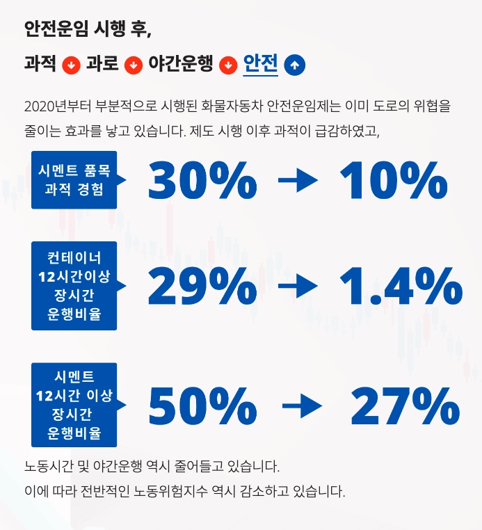 화물 차주 약 400명을 대상으로 조사한 설문조사에 따르면 안전운임제 이후 과적 경험은 약 11% 감소, 졸음운전 경험 비율은 약 21.% 감소했다고 밝혔습니다.