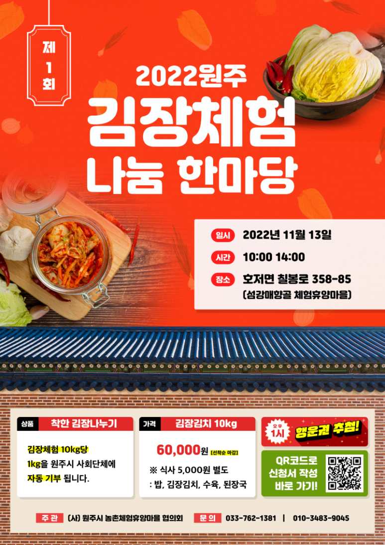 원주에서 생산한 신선한 재료로 만드는 김치도 만들고 자동으로 기부까지 하는 착한 김장 나눔 행사입니다. 원주지역단위농촌관광사업의 일환으로 한정수량만 30% 할인가를 제공하고 있습니다.